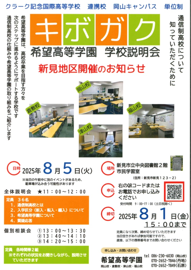8月5日(火)に、新見市立中央図書館2階市民学習室で学校説明会を実施します。午前中は全体説明会、午後は個別説明会をします。ご希望の方は、下のQRコードか、お電話(086-230-6030)にてお申し込みください。お気軽にご参加ください。お待ちしています。